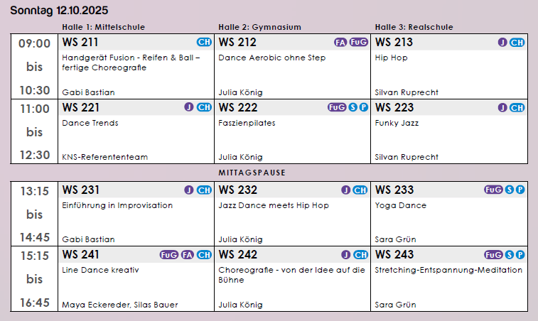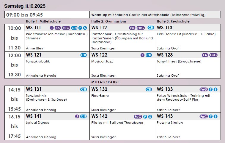 Die Teilnehmenden haben die Möglichkeit, in den von ihnen selbst zusammengestellten Workshops (WS) verschiedene Bereiche kennenzulernen. Dieses Jahr stehen wieder zahlreiche verschiedene Workshops zur Auswahl, die wahlweise nur an einem Tag oder am Samstag und Sonntag besucht werden können. Los geht`s am Samstag mit einem gemeinsamen Warm-up mit Sabrina Graf.