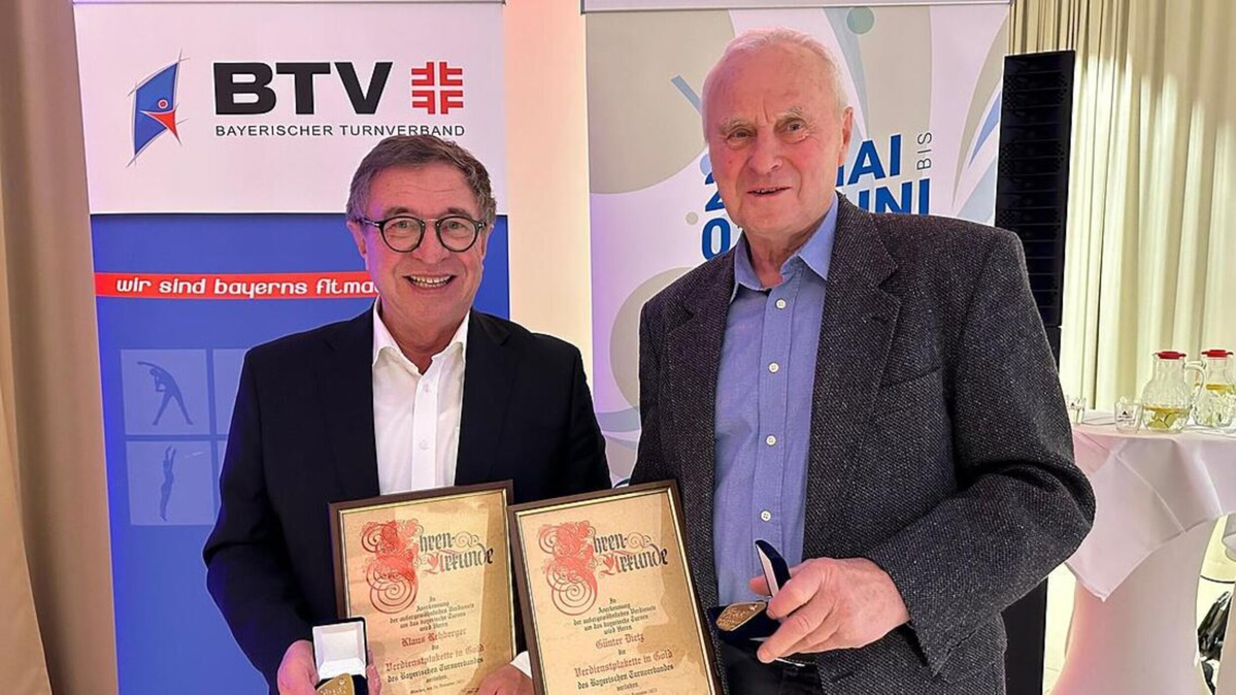 Günter Dietz und Klaus Rehberger wurden mit der goldenen Verdienstplakette für ihre ehrenamtlichen Tätigkeiten ausgezeichnet. Der Präsident des Bayerischen Turnverbands (BTV) Dr. Alfons Hölzl überreichte den Geehrten eine Urkunde. Gleichzeitig unterstrich er ihre Bedeutung für die positive Entwicklung des Verbandes in den letzten Jahrzehnten: "Ohne ehrenamtliches und freiwilliges Engagement wäre unser Sportsystem nicht lebensfähig. Die geehrten Funktionäre sind leuchtende Beispiele unserer Turnbewegung und dienen als Vorbilder für die nächsten Generationen. Ohne deren Mitwirken würde der Turnsport in Bayern nicht so positiv dastehen, wie er es heute tut."
