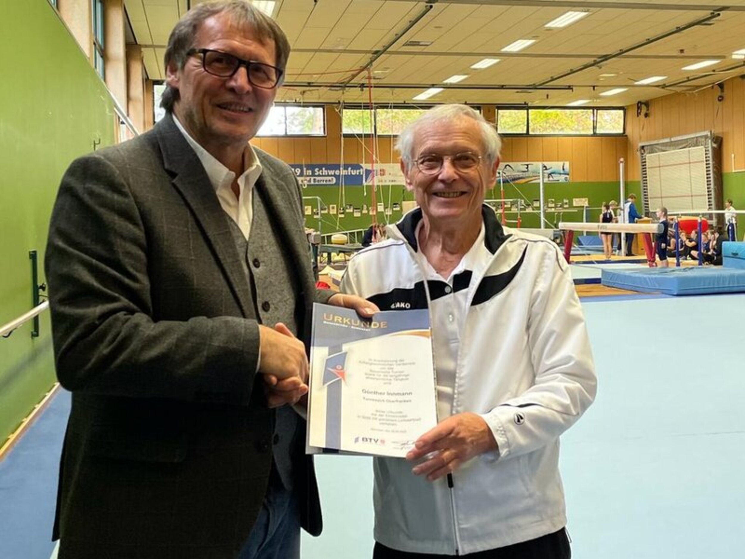 Günter Innmann erhält die Ehrennadel in Gold mit goldenem Lorbeerblatt des BTV mit Urkunde.