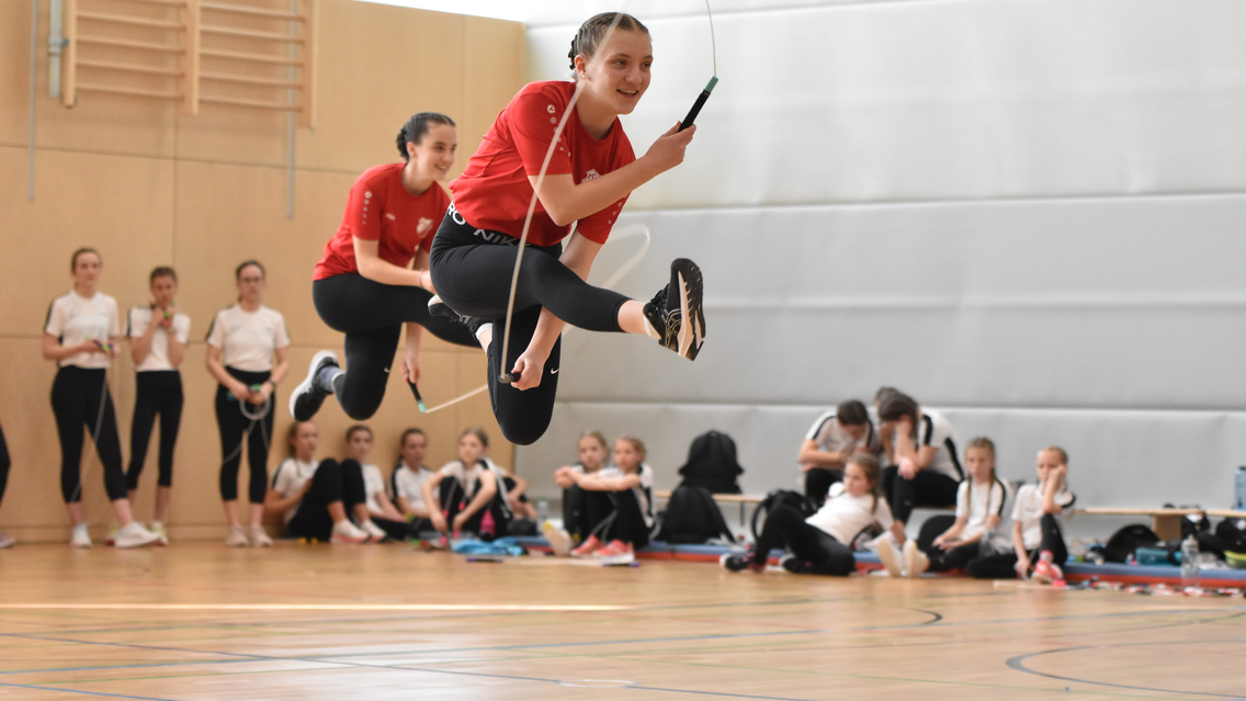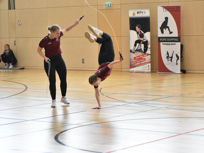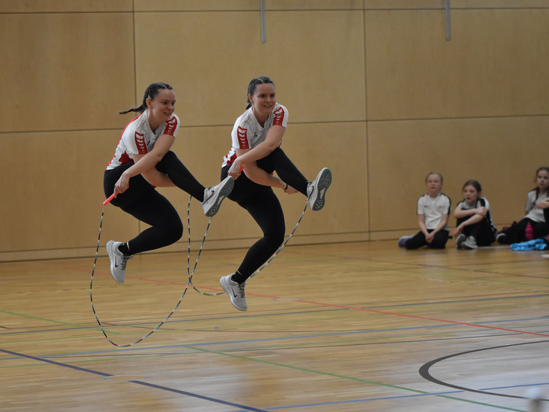 Als nächstes standen die Freestyles auf dem Programm, wobei bei Mannschaftswettkämpfen in verschiedenen Formationen angetreten wird - zu zweit, zu dritt oder zu viert mit dem Einzelseil, den Wheel-Seilen oder in Double Dutch-Seilen. Untermalt von ausgewählter Musik müssen die Athleten eine selbst zusammengestellte Sprungfolge präsentieren. Diese wird vom neun-köpfigen Kampfgericht, das in diesem Jahr von einigen externen Kampfrichtern aus Baden-Württemberg unterstützt wurde, hinsichtlich Schwierigkeit, Pflichtelementen und Kreativität bewertet. Aufregung und wenig Vorbereitungszeit aufgrund der Einzelmeisterschaft Ende Januar sorgten für ein sehr gemischtes Feld - fast fehlerfreie Durchgänge wechselten sich ab mit Freestyles geprägt von Unsicherheiten. Insgesamt bot sich dem Publikum dennoch ein spannender Nachmittag mit eindrucksvollen Präsentationen. Im Single Rope und Wheel konnten insbesondere die WM-Teilnehmer des letzten Jahres vom TSV Wacker 50 Neutraubling bzw. FC Stätzling wieder tolle Leistungen abrufen. Bei den Double Dutch-Freestyles sind vor allem die Mädels vom TV Augsburg zu loben, die sich mit ordentlichen Choreographien unter den 14- bis 15-jährigen Gold sicherten.