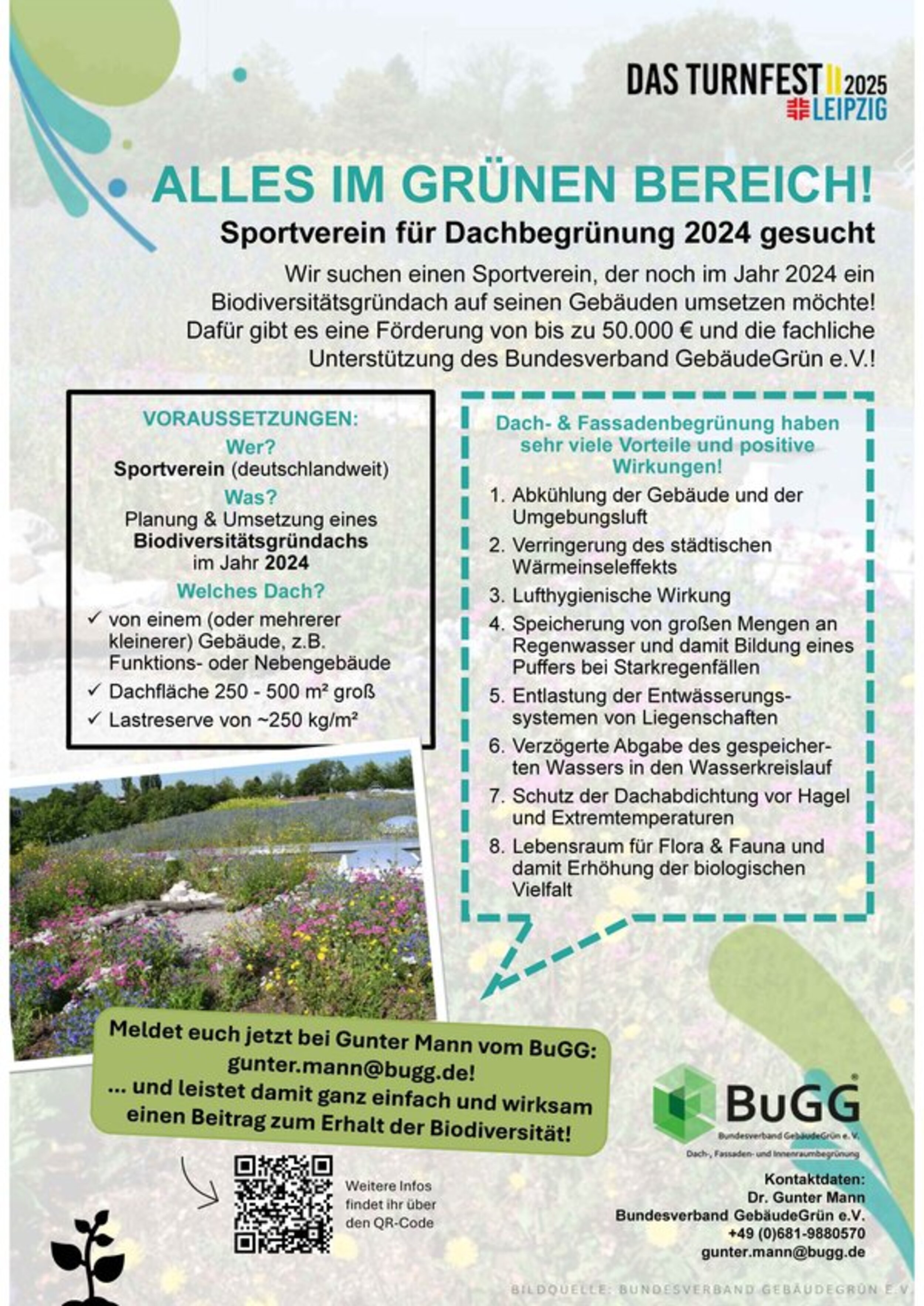 Das Internationale Deutsche Turnfest sucht in Zusammenarbeit mit dem Bundesverband Gebäudegrün e.V. einen Verein, der Interesse und die Voraussetzungen für die Planung und Umsetzung eines Biodiversitätsdaches auf einem Vereinsgebäude im Jahr 2024 hat. Das Projekt wird mit bis zu 50.000 € gefördert. Weitere Informationen bei Gunter Mann (gunter.mann@bugg.de).