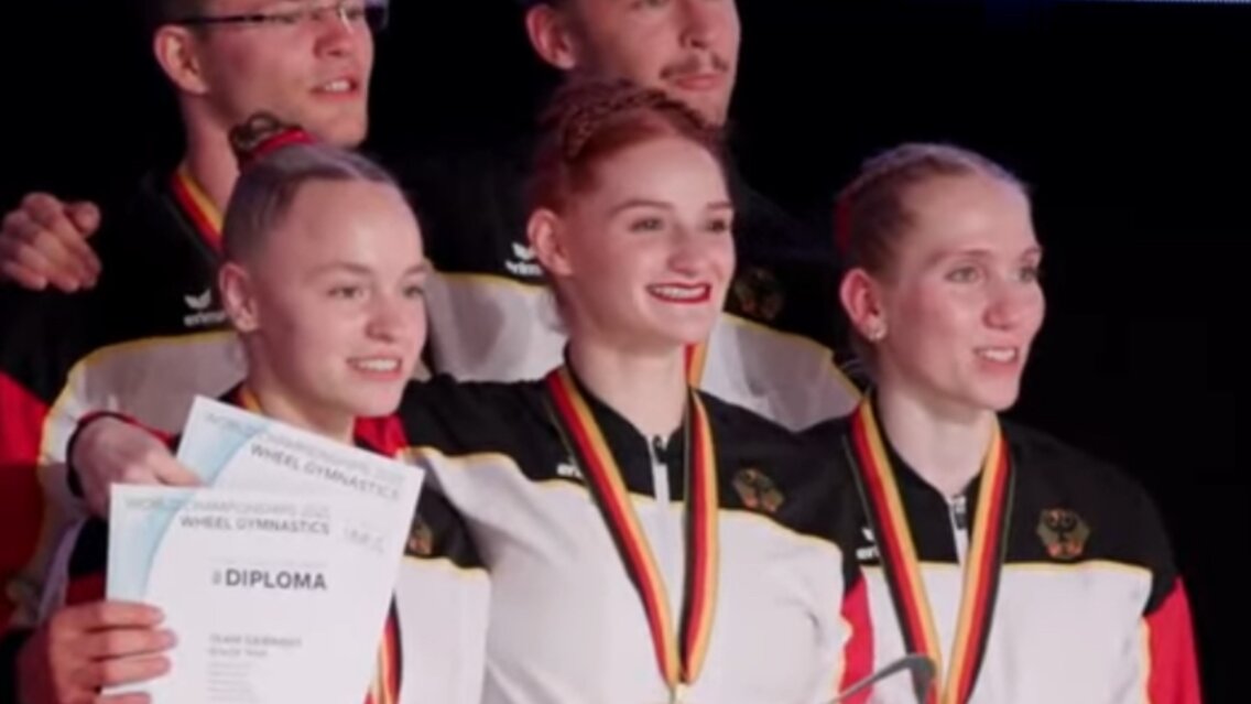 Lea Gmeiner gewinnt bei der Rhönrad-Team-WM am Samstag in Leipzig mit der deutschen Nationalmannschaft der Seniorinnen und Senioren Gold