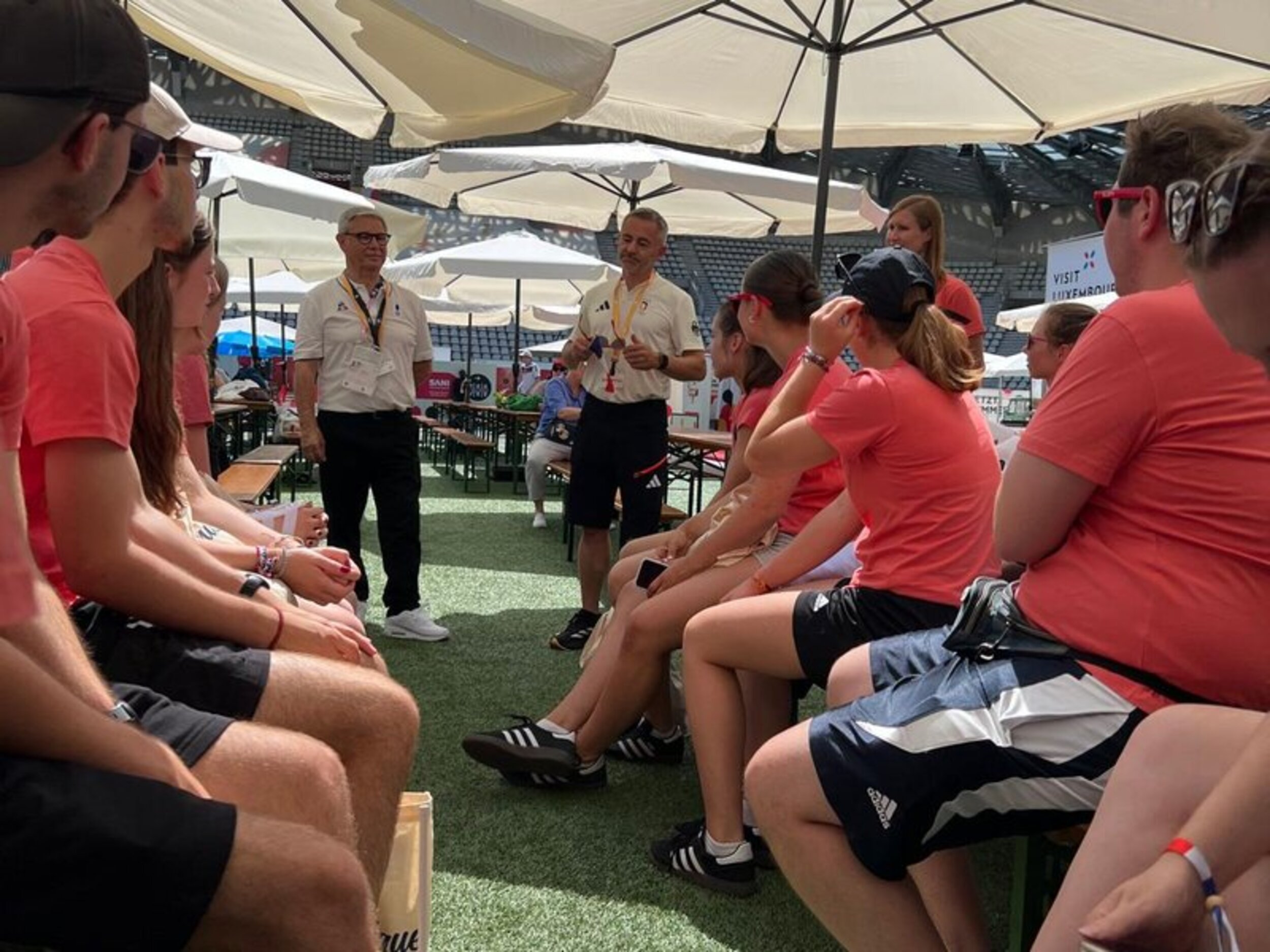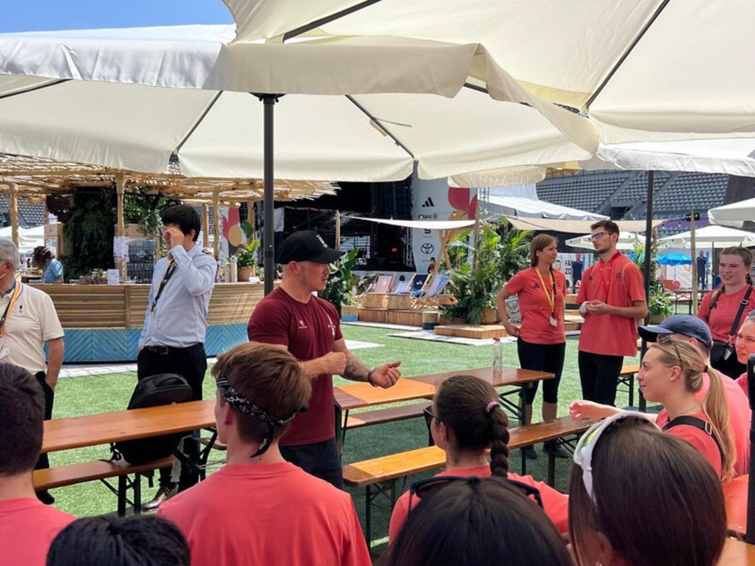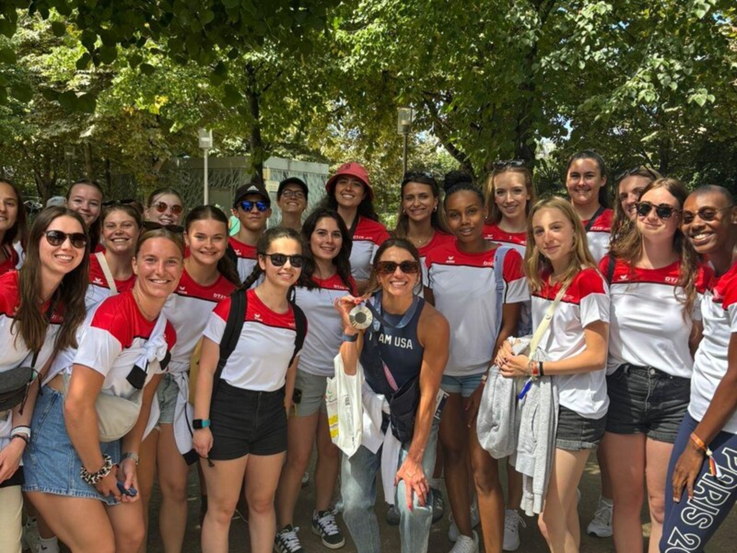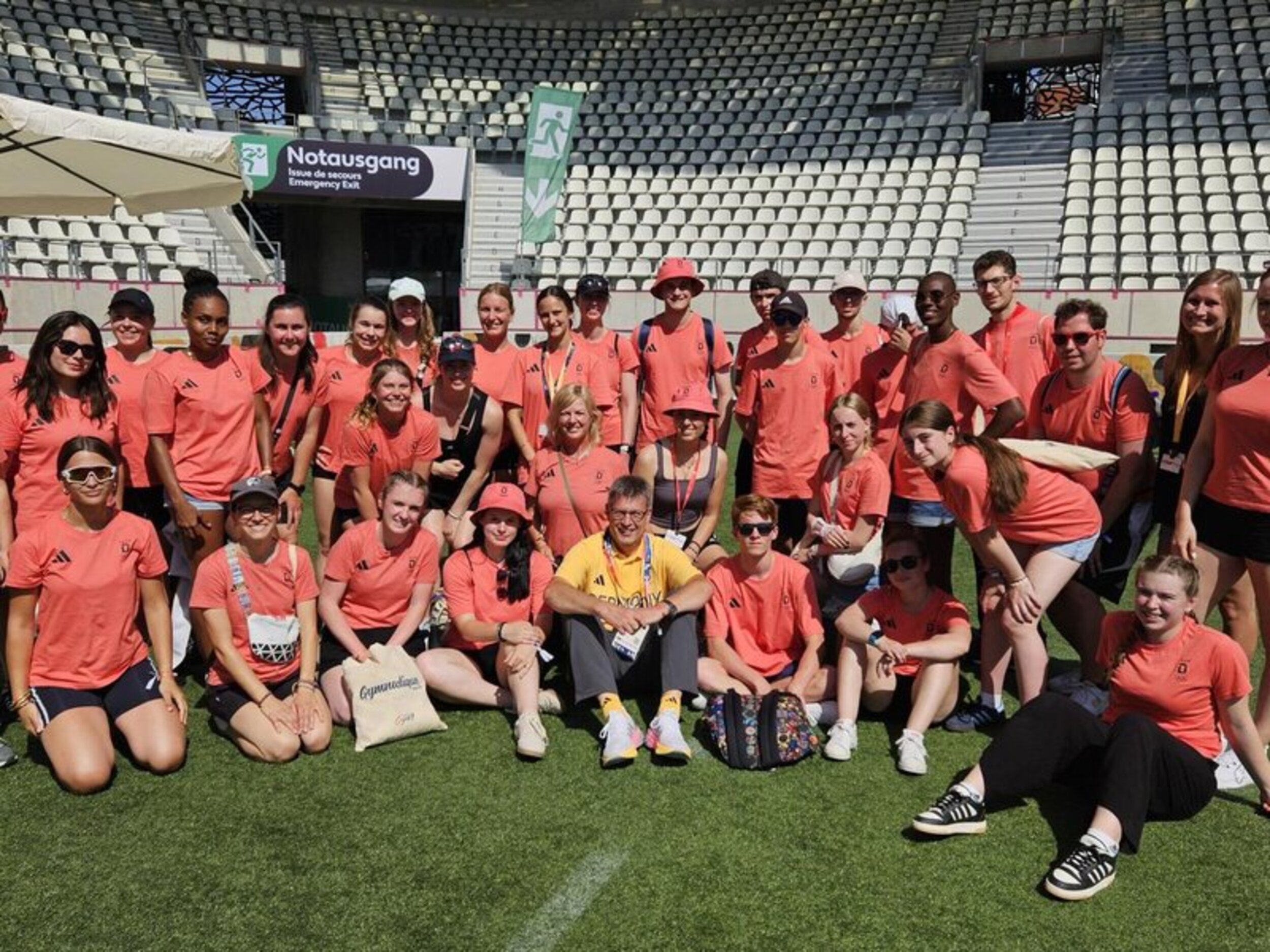 Am 26. Juli startete das Abenteuer Olympia für die deutschen Sportbegeisterten in Frankfurt. Am Abend verfolgten wir zusammen noch die Live-Übertragung der Eröffnungsfeier der Olympischen Spiele in Paris, woraufhin es am nächsten Morgen schon früh mit dem Bus Richtung Frankreich losging. Nachmittags kamen alle voller Vorfreude in unserer Unterkunft in Cergy, nordwestlich von Paris, an. Hier warteten schon die französischen Teilnehmer*innen auf uns und wir lernten uns mit Kennenlern-Spielen besser kennen. Am Samstag startete dann unserer erster richtiger Tag im Tuju-Camp. Vormittags verfolgten wir gespannt den Live-Stream der Gerätturn-Qualifikation der Frauen, bevor es am Nachmittag zur Stadt-Rallye nach Paris ging. Zum Abschluss dieses ersten tollen Tages ging es noch auf den Eiffelturm. Am 2. Tag besuchten wir das Deutsche Haus und die FanZone, wo wir auf der großen Bühne auftreten durften. Anschließend ging es für die ganze Gruppe zum Rugby-Spiel. Der Dienstag begann mit einem Workshop, woraufhin wir anschließend in die Gallery Lafayette fuhren. Dort besuchten wir einen Backkurs und lernten, wie typisch französische Macarons gemacht werden. An Tag 4 besuchte ein Teil der Gruppe die Hockey- und Ruderwettkämpfe und konnte sogar den Bronze-Medaillen-Sieg des Frauen-Doppelvierers live erleben, während der Rest der Gruppe beim Wasser-Rafting selbst aktiv war. Den Abend ließen wir mit einer Party ausklingen. Am fünften Tag probierten wir selbst die Paralympische Sportart Goalball aus und bekamen am Nachmittag einen exklusiven Einblick hinter die Kulissen des Moulin Rouge. Einige besuchten zudem ein Volleyball- und Handball-Spiel. Freitag war dann schon unser letzter Tag in Paris: Am Vormittag spielten wir Pétanque mit einem französischen Verein oder feuerten die Sportler bei der Leichtathletik an. Nachmittags besuchten wir gemeinsam die französische FanZone und ließen unsere Camp-Zeit mit einer Abschlussparty ausklingen. Damit ging dann auch eine sehr spannende, faszinierende und aufregende Woche bei den Olympischen Spielen 2024 in Paris zu Ende und am Samstag für die deutschen Teilnehmer*innen wieder zurück in die Heimat.