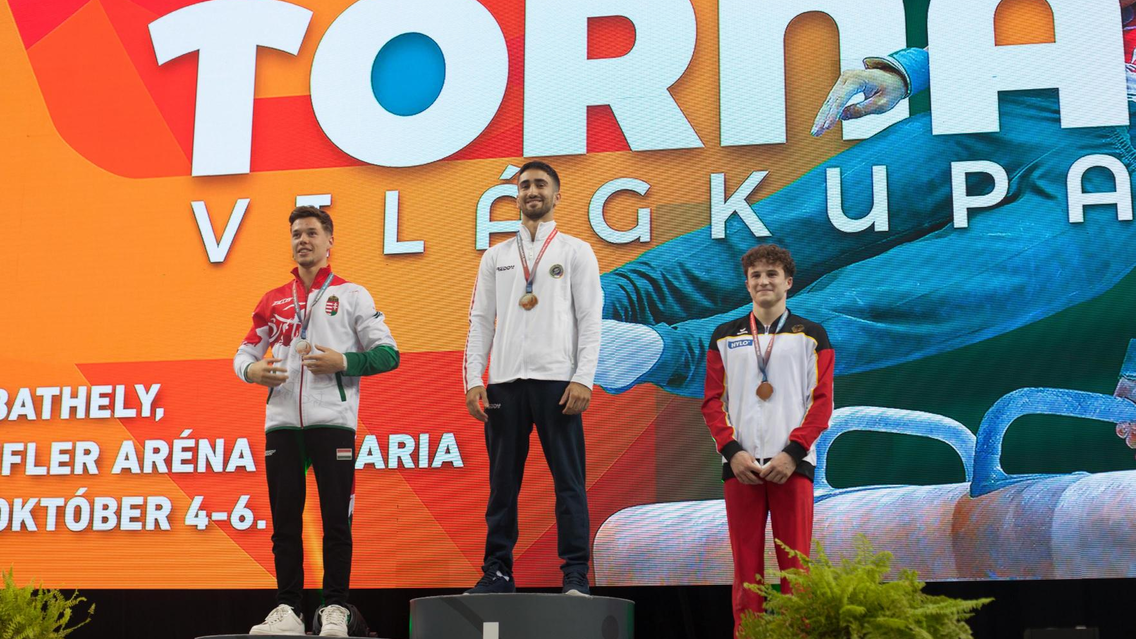 Unser Olympia-Ersatzturner Alexander Kunz vom TSV Pfuhl gewann am Wochenende beim World Challenge Cup im ungarischen Szombathely seine erste internationale Medaille. Am Barren sicherte sich der 21-Jährige mit 13,233 Punkten die Bronzemedaille. Im spannenden Finale am Sonntag musste sich Kunz nur dem Italiener Edoardo De Rosa (14,233) und dem Lokalmatador Krisztofer Meszaros (14,066) geschlagen geben.