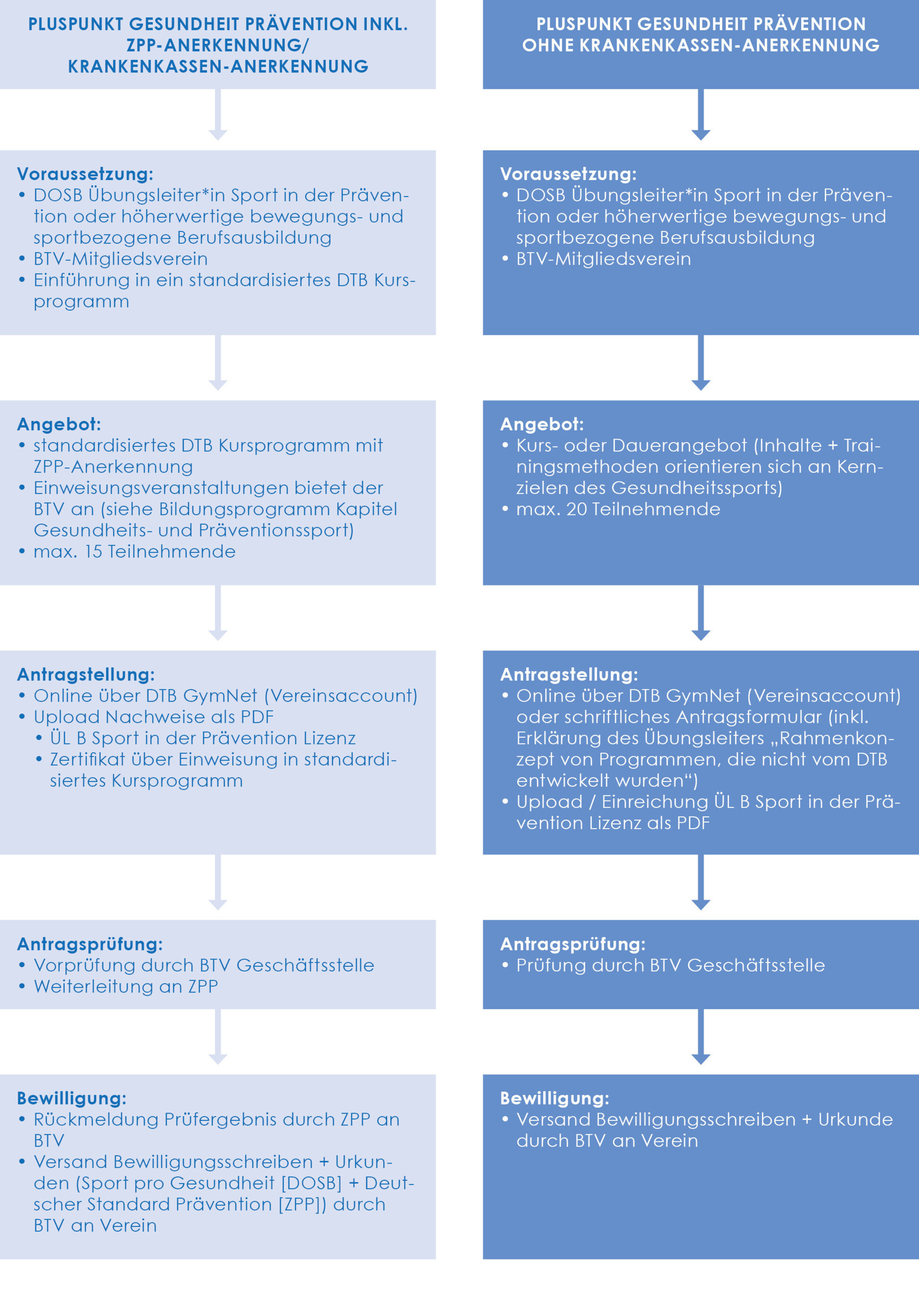 Die gesetzlichen Krankenkassen sehen laut Satzung die Erbringung von Leistungen zur Verhinderung & Verminderung von Krankheitsrisiken (= primäre Prävention) sowie zur Förderung eines selbstbestimmten gesundheitsorientierten Handelns der Versicherten (= Gesundheitsförderung) vor (§20 SGB V Abs. 1). Turn- und Sportvereine können zur Wahrnehmung dieser Aufgabe von den Krankenkassen zertifiziert werden. Präventive und gesundheitsfördernde Angebote, können von den Krankenkassen zertifiziert werden, wenn sie bestimmte Kriterien erfüllen. Diese Prüfkriterien sind im Leitfaden Prävention des GKV-Spitzenverbandes festgelegt. Die Zentrale Prüfstelle Prävention (eine Gemeinschaftseinrichtung der gesetzlichen Krankenkassen in Deutschland) vergibt nach Prüfung der Kriterien-Erfüllung für Angebote zur individuellen verhaltensbezogenen Prävention das Prüfsiegel „Deutscher Standard Prävention“. Diese geprüften und zertifizierten Angebote sollen den Teilnehmenden bei der Vorbeugung von Krankheitsrisiken und der Stärkung ihrer gesundheitlichen Potenziale und Ressourcen unterstützen. Die Auszeichnung mit diesem Prüfsiegel "Deutscher Standard Prävention" ist Voraussetzung für die Förderung bzw. Bezuschussung von Kursangeboten.